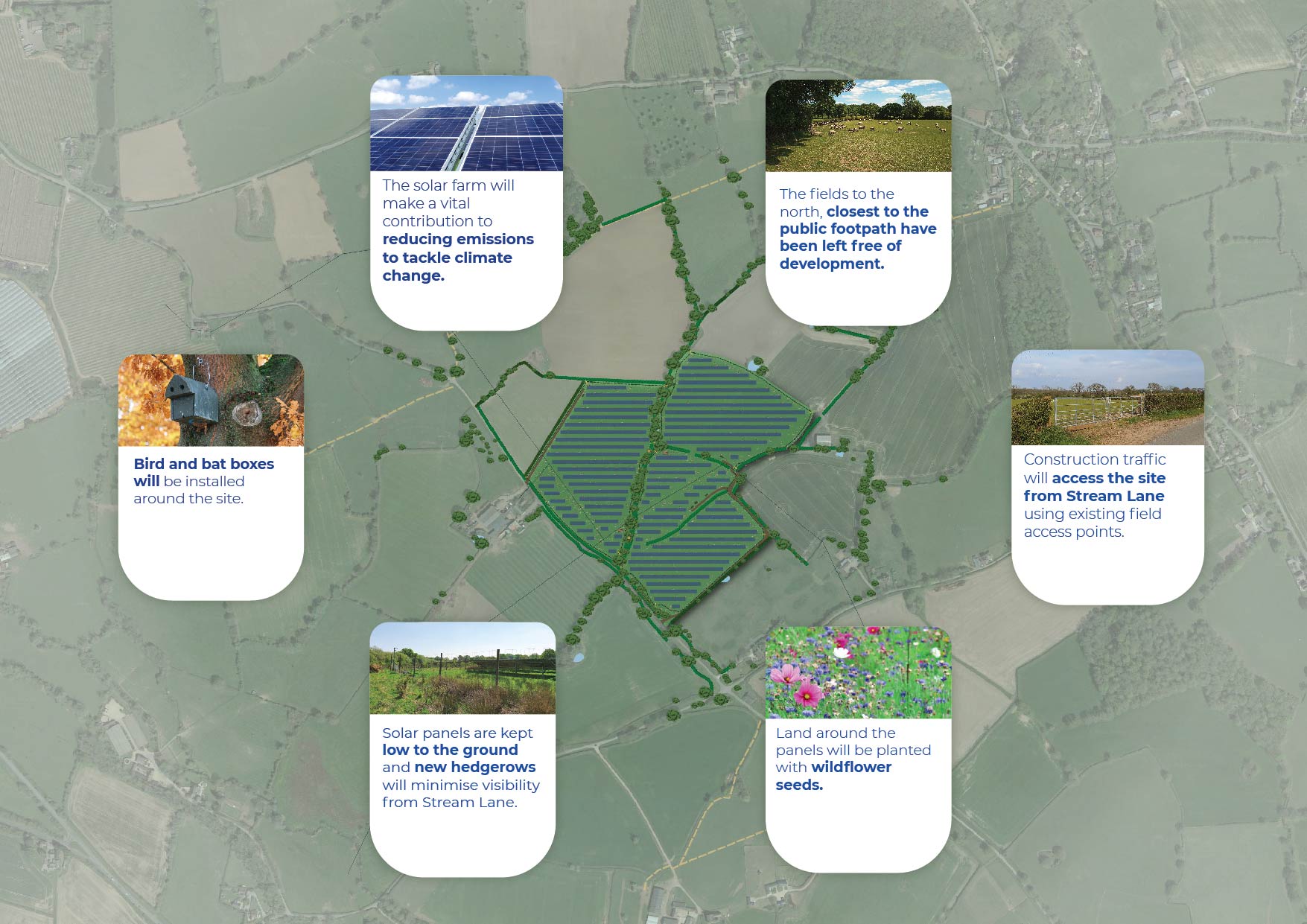 Solar farms take up a very small proportion of the land they occupy, leaving huge scope for biodiversity. Research has shown they improve the diversity and abundance of broad-leaved plants, grasses, butterflies, bumblebees and birds, including those with conservation status. Details of the enhancements we will provide can be found in the graphic, and we would welcome your comments on this.
